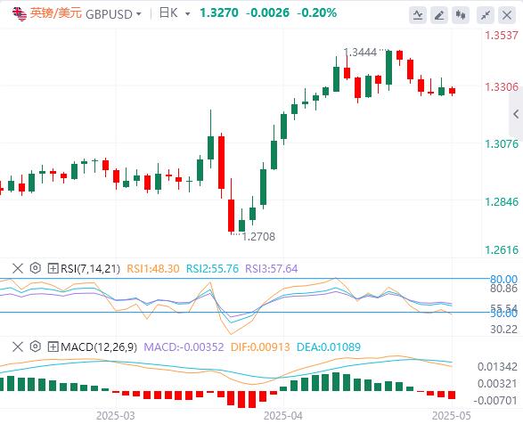 5月6日,北京时间周二亚市早盘,美元指数徘徊在100附近。周一,美元指数在亚盘、欧盘震荡下跌,后因超预期的ISM非制造业数据提振,美元指数回升至100美元下方,最终收跌0.24%,报99.79。基准的10年期美债收益率收报4.350%;对货币政策更敏感的两年期美债收益率收报3.8450%。受美元走软和避险需求推动,现货黄金日内一度涨近100美元,最终收涨2.85%,报3332.85美元/盎司。现货白银最终大涨1.42%,报32.45美元/盎司。因市场消息称欧佩克+将继续加速增产,原油周一开盘大跌5%,收盘下跌逾1美元。WTI原油最终收跌2.06%,报57.15美元/桶;布伦特原油收跌1.82%,报60.30美元/桶。