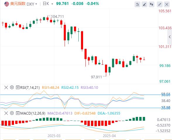 周一,美元指数在亚盘、欧盘震荡下跌,后因超预期的ISM非制造业数据提振,美元指数回升至100美元下方,截至目前,美元报价99.76。