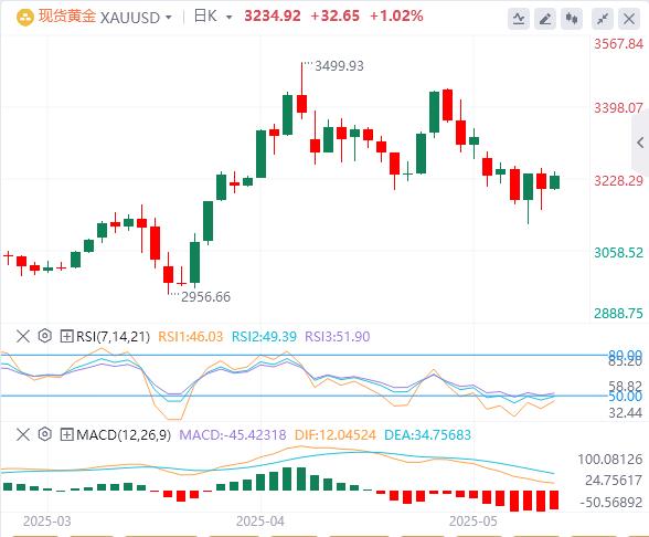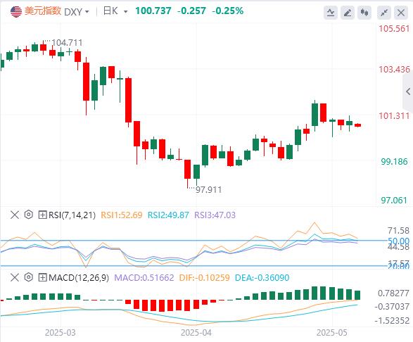 5月19日,北京时间周一亚市早盘,美元指数徘徊在100.73附近。上周五的最新一轮经济数据显示美国4月进口物价反弹,而5月消费者信心仍然低迷,美元指数先跌后涨,盘中一度重回101关口,但未能站稳在这一关口上方,最终收涨0.18%,报100.99。基准的10年期美债收益率收报4.484%;对货币政策更敏感的两年期美债收益率收报4.014%。现货黄金上周五一度大跌超2%,至3154.29美元的日内低点,虽在尾盘收复部分失地,但仍创下自去年11月以来最糟糕的一周,最终收跌1.18%,报3202.27美元/盎司。现货白银最终收跌1.1%,报32.26美元/盎司。受穆迪下调美国信用评级的影响,现货黄金周一大幅上涨,并逼近3240美元关口。两油有所回升,WTI原油收涨1.1%,报61.87美元/桶;布伦特原油收涨1.03%,报64.90美元/桶。