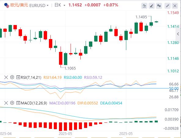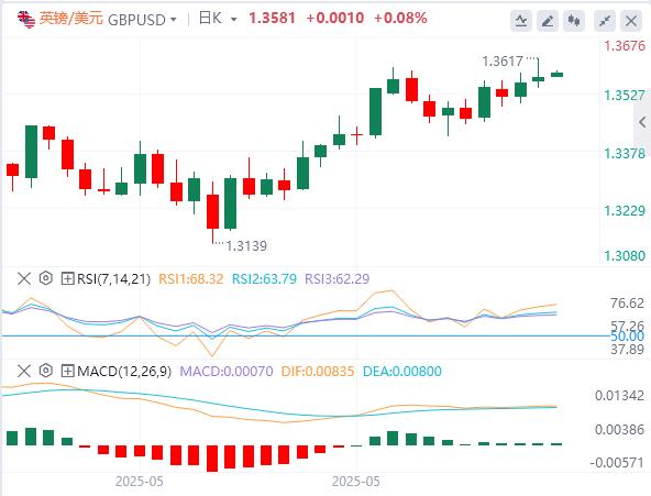 技术面:从日线图来看,黄金当前震荡于布林带中上轨之间,整体仍处于上升趋势中的整理阶段。价格在突破3300美元后暂时受阻于3430美元一线,该位为前期高位区域,亦为布林带上轨所对应的短线阻力。分析认为,若后续放量突破3430美元,则有望重新挑战3499.83美元的高点。MACD指标方面,快线(DIFF)与慢线(DEA)处于零轴上方,呈现温和金叉,柱状图微幅翻红,动能开始修复,暗示短线有进一步走强可能。相对强弱指数(RSI)目前徘徊在58附近,未出现超买信号,显示市场情绪相对中性偏多,为后续上涨保留空间。整体结构上看,黄金呈现明显箱体震荡格局,支撑位参考3300美元关口,阻力位关注3430美元水平;一旦突破,则上方空间有望进一步打开。