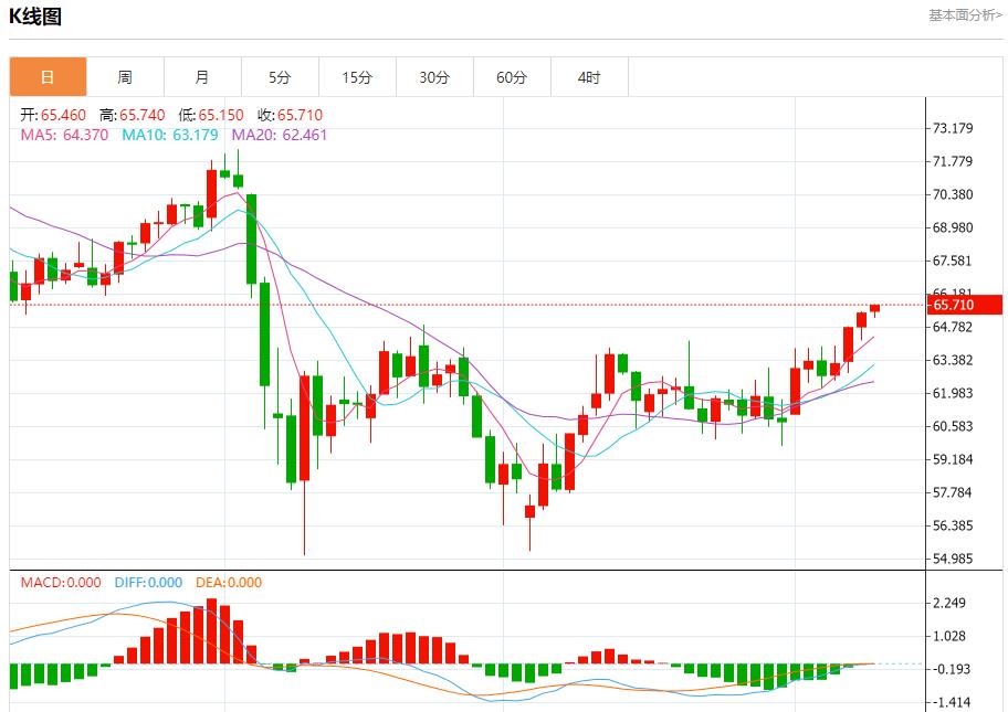 原油市场:截止北京时间20:26,美油上涨,现报65.710,涨幅0.66%。纽市盘前,(原油)价格在最近的盘中交易中以上涨结算,试图突破64.75美元的关键阻力位,该阻力位阻止(RSI)达到超买水平,并且由于需要卸载这种超买条件,在短期基础上的看涨趋势占主导地位以及沿着一条斜线交易的情况下,开始出现负面重叠信号。