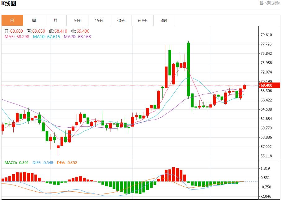原油市场:截止北京时间20:23,美油上涨,现报69.400,涨幅1.40%。纽市盘前,(原油)价格在最后一个盘中交易中上涨,突破关键阻力位68.00美元,受到EMA50上方持续交易的支撑,并且在短期主要看涨趋势的主导地位下,沿着偏倚线交易,另一方面,我们注意到(RSI)开始出现负面信号,在达到超买水平后,这可能会减慢盘中价格的上涨速度。