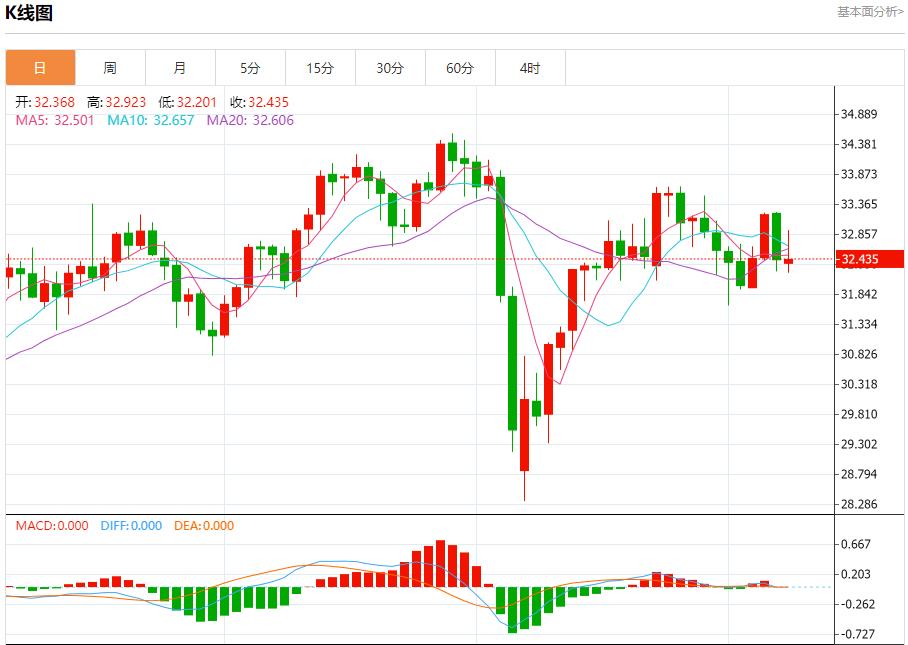 现货白银:截止北京时间20:20,现货白银上涨,现报32.432,涨幅0.00%。纽市盘前,银价在最后一个交易日面临负面压力,在短期内拒绝突破看涨的修正偏向线,同时超过EMA50的支撑,形成额外的压力。