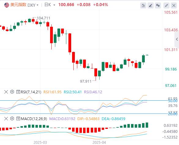 5月9日,北京时间周五亚市早盘,美元指数徘徊在100.66附近。周四,特朗普宣布与英国达成“突破性”贸易协议,美元指数触及4月10日以来的最高读数,最终收涨0.76%,报99.86。基准的10年期美债收益率收报4.2740%;对货币政策更敏感的两年期美债收益率收报3.7870%。现货黄金一度下触3290美元,最终收跌1.79%,报3304.98美元/盎司;现货白银收跌0.15%,报32.45美元/盎司。因英美达成贸易协议,以及美国宣布对伊朗石油的企业实施制裁,国际油价大涨逾3%。WTI原油最终收涨3.99%,报60.22美元/桶;布伦特原油收涨3.69%,报63.17美元/桶。