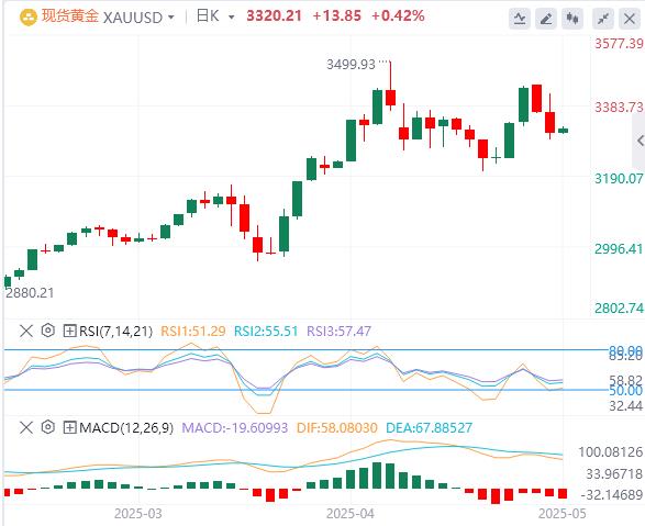 周五亚盘,黄金交投3320.21附近。黄金周四延续跌势,下挫近2%,现货黄金盘中最低触及3288.72美元/盎司,收报3305.70美元/盎司,此前美国总统特朗普宣布与英国达成贸易协议,从而提高了与其他国家达成此类协议的希望,缓解了市场的紧张情绪,打压黄金的避险买盘,美元、美股和美债收益率上涨,也打压金价走势。本交易日需要密切关注国际贸易局势相关消息和市场情绪的变化,另外,有多位美联储官员将发表讲话,投资者也需要予以关注。