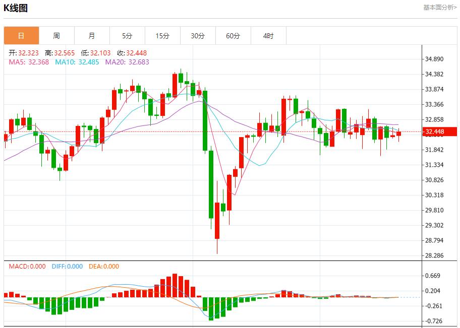 现货白银:截止北京时间20:20,现货白银上涨,现报32.452,涨幅0.37%。纽市盘前,(白银)价格在最近的日内交易中出现波动,在(RSI)上出现积极信号,对价格形成一些支撑,但价格在EMA50下方保持稳定,短期内处于小幅熊市。