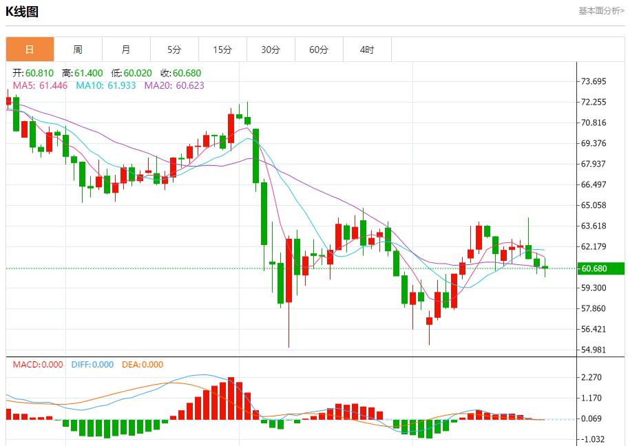 原油市场:截止北京时间20:21,美油下跌,现报60.670,跌幅0.87%。纽市盘前,(原油)价格在窄幅横盘交易中波动,价格设法摆脱了受其短期退出看涨通道范围影响的(RSI)超卖状况,由于其交易低于EMA50,负面压力持续存在。