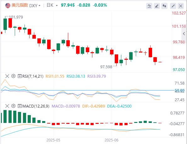 6月25日,北京时间周三亚市早盘,美元指数徘徊在97.94附近。周二,因特朗普宣布伊以停火的消息打击了避险买盘,美元指数亚盘、欧盘持续下跌近0.50%,失守98关口,后因鲍威尔暗示他将抵制7月降息的呼吁而小幅回升,最终收跌0.40%,报97.96。基准的10年期美债收益率收报4.2960%,2年期美债收益率收报3.8310%。因伊以停火打击避险情绪,以及鲍威尔称在考虑降息前需要更多时间,现货黄金一度跌破3310美元关口,最终收跌1.67%,收报3322.82美元/盎司;现货白银最终收跌0.46%,报35.90美元/盎司。由于市场预期伊以停火将降低中东石油供应中断的风险,油价下跌6%,创两周新低。WTI原油盘中一度回落至64美元/桶下方,最终收跌3.35%,报64.96美元/桶;布伦特原油收跌3.7%,报67.73美元/桶。