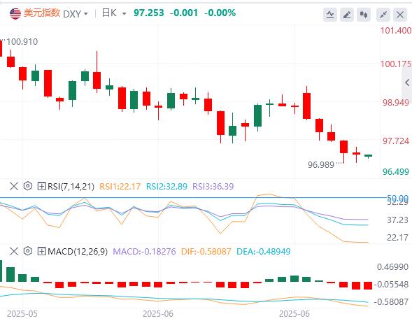 美元指数:截止发稿,美元指数徘徊在97.25附近。在美联储首选的通胀指标核心PCE在5月份上升后,美元指数下跌。美元继续走弱,美元指数接近周四的美国密歇根消费者信心指数97.00的低点和密歇根预期,为了解消费者对当前状况的感受提供了更多见解。技术面上,如果美元指数跌破最近的支撑位96.70–96.90,它将走向下一个支撑位95.40–95.60。