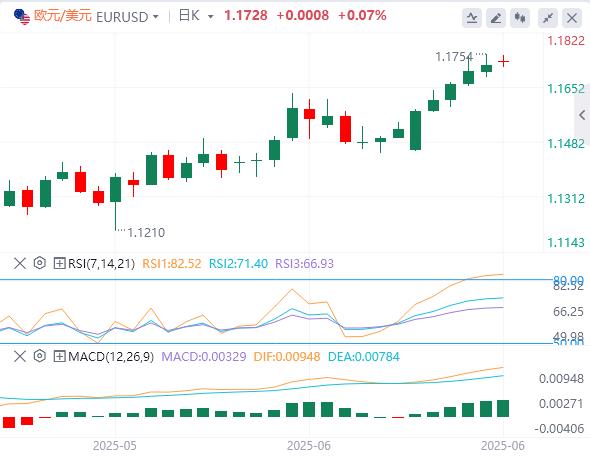 欧元/美元周一欧洲早盘在1.1700上方小幅上涨。欧洲央行(ECB)行长克里斯蒂娜·拉加德(ChristineLagarde)将在葡萄牙辛特拉举行的欧洲央行中央银行2025论坛开幕招待会和晚宴上发表介绍性演讲。