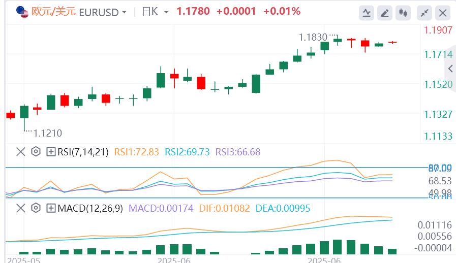 美元指数:截止发稿,美元指数徘徊在96.95附近。美元指数的走势受到多重基本面因素的推动。首先,特朗普关税言论持续发酵,市场对全球贸易前景的担忧加剧。本周美联储将公布上次FOMC会议纪要,市场高度关注其是否释放出未来可能降息的信号。分析师指出,若纪要偏鸽,表明决策者对经济前景持谨慎态度,美元可能面临回调压力;反之,若强调维持高利率的必要性,则有望提振美元走强。尽管美国下周宏观数据有限,但此前6月非农就业数据强劲,失业率下降,为美元提供一定支撑。技术面上,美元指数最近试图摆脱年度低点,但在50MA附近面临阻力。如果美元指数攀升至97.15的50MA上方,它将向下一个阻力位98.00–98.20移动。