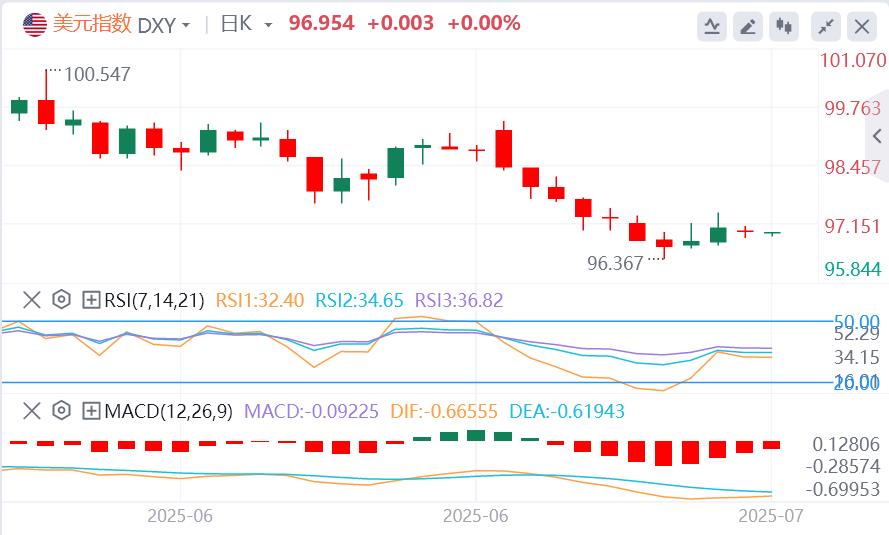 7月7日,北京时间周一亚市早盘,美元指数徘徊在96.95附近。上周五,因特朗普力推的“大而美法案”成功闯关众议院,美元指数有所回落,并在97关口附近来回震荡,最终收跌0.07%,报96.93。现货黄金震荡上行,盘中一度重回3340美元,但未能企稳在这一关口上方,最终收涨0.35%,收报3337.22美元/盎司;现货白银最终收涨0.25%,报36.93美元/盎司。因市场预计欧佩克+将再次增产,两油有所下跌。WTI原油在欧盘时段急速下跌,并一度至65.24美元的日内低点,最终收跌1.07%,报65.62美元/桶;布伦特原油收跌0.62%,报68.14美元/桶。