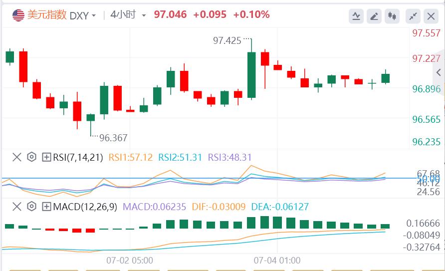 上周五,因特朗普力推的“大而美法案”成功闯关众议院,美元指数有所回落,截至目前,美元报价97.04。