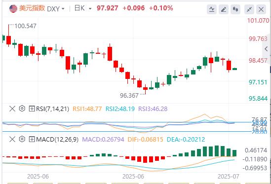 周一,由于股市走强减少了对美元的流动性需求,加之美债收益率走低,美元指数走低,下破98关口,截至目前,美元报价97.92。