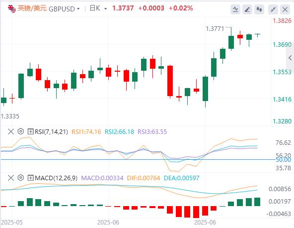 美元指数:截止发稿,美元指数徘徊在96.70附近。由于美国股指在2025年第二季度表现强劲,创下历史新高,市场情绪依然积极。因此,美元(USD)接近多年低点,因市场预期财政赤字将大幅增加,市场参与者预计美联储(Fed)将放宽超过50个基点(bps),这推动了欧元接近四年高点。技术面上,美元指数最近的支撑位位于96.70–96.90区间。跌破96.70水平将推动美元指数走向下一个支撑位,即位于95.40–95.60区间。