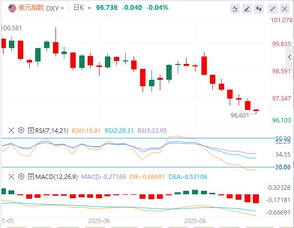 周一,美元指数日内震荡下行,跌破97关口,截至目前,美元报价96.83。