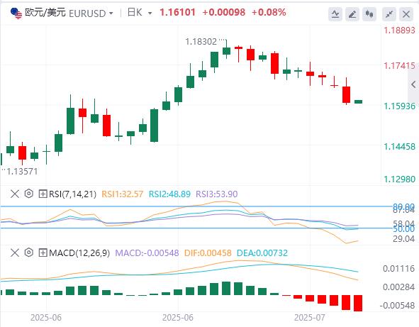 美元指数:截止发稿,美元指数徘徊在98.55附近。美元指数连续第二个交易日站稳关键支撑位97.899后,延续涨势向50日均线98.80逼近。6月消费者物价指数(CPI)环比上涨0.3%,同比上涨2.7%;核心通胀略低于预期,录得2.9%。联邦基金期货目前显示,市场预期年底前将降息50个基点,9月可能成为降息启动时点。技术面上,如果美元指数收于98.50水平上方,它将走向阻力位99.20–99.40。。