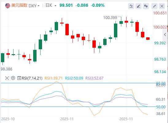 11月27日,北京时间周四亚市早盘,美元指数徘徊在99.50附近。周三,美元指数呈现倒V走势,盘中一度逼近100关口,但随后急转直下,最终收跌0.237%,报99.57;美债收益率涨跌不一,基准的10年期美债收益收报3.997%%,对美联储政策利率敏感的2年期美债收益率收报3.483%。由于市场对美联储在下月会议上降息的预期进一步增强,现货黄金走高,再创一周多新高,最终收涨0.8%,报4163.76美元/盎司;现货白银涨势更加显着,最终收涨3.63%,报53.36美元/盎司。国际原油跟随风险资产走高,较前一交易日触及的一个月低点小幅反弹,市场呈现感恩节假期前成交量稀薄的典型特征。WTI原油震荡走高,最终收涨0.67%,报58.48美元/桶;布伦特原油最终收涨0.71%,报62.41美元/桶。