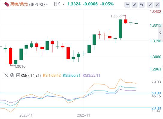 英镑兑美元周一欧洲交易日仍处于1.3300以上盘整阶段,此前一周上涨约0.75%。