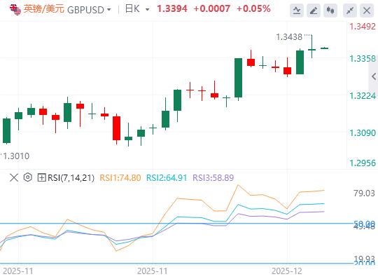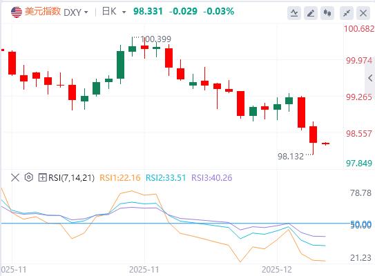 12月12日,北京时间周五亚市早盘,美元指数徘徊在98.33附近。周四,美国就业数据低于预期,美元指数延续下跌趋势,最终收跌0.60%,报98.65;基准的10年期美债收益率最终收报4.1610%,对美联储政策利率敏感的2年期美债收益率收报3.5510%。现货黄金触及逾一个月以来的最高水平,最终收涨1.21%,报4279.89美元/盎司;现货白银续创历史新高,最终收涨3%,报63.57美元/盎司。受乌克兰与俄罗斯潜在和平协议进展的压力影响,国际油价下跌。WTI原油最终收跌1.76%,报57.91美元/桶;布伦特原油最终收跌1.47%,报61.59美元/桶。