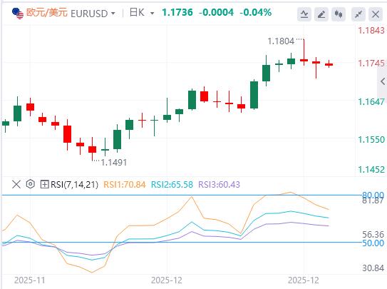 欧元:20期简单移动平均线(SMA)在价格周围趋于平坦,而50期、100期和200期均线分别在1.1705、1.1662和1.1608上升,保持与其上方的现货保持多头对齐。相对强弱指数(14)为54,中性且略有上升。