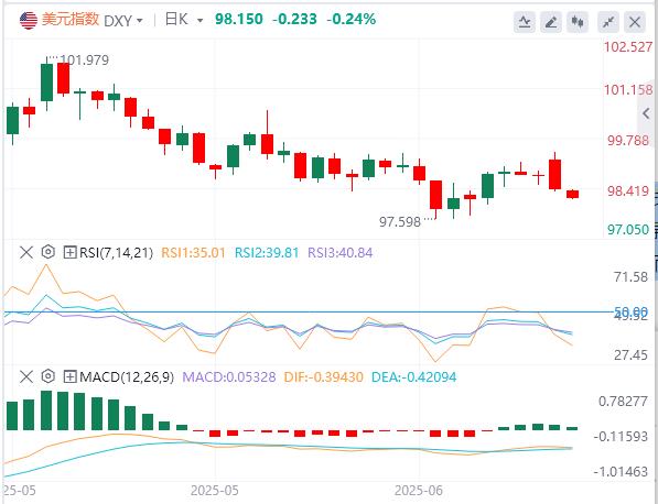 6月24日,北京时间周二亚市早盘,美元指数徘徊在98.15附近。周一,美元指数亚盘震荡、欧盘触及99.40,后因美盘期间美联储官员的鸽派言论下跌失守99美元关口,最终收跌0.43%,报98.35。基准的10年期美债收益率收报4.3490%,2年期美债收益率收报3.8700%。因伊朗在袭击前几个小时通知了美国和卡塔尔,特朗普称是时候实现和平,现货黄金尾盘转跌,最终收跌0.11%,收报3367.56美元/盎司;现货白银最终收涨0.14%,报36.07美元/盎司。因伊朗的报复力度不及投资者预想般严重,石油供应担忧缓解,国际原油暴跌逾8%。WTI原油最终收跌9.11%,报67.22美元/桶;布伦特原油收跌8.86%,报70.33美元/桶。