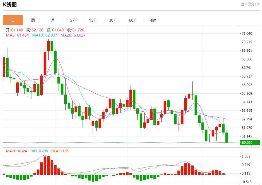 原油市场:截止北京时间20:23,美油下跌,现报60.560,跌幅1.53%。纽市盘前,(原油)价格在最近一个交易日继续下跌,退出了限制其之前短期交易的看涨修正通道的范围,由于其交易低于EMA50而继续承受负面压力,这加剧了负面压力,相对强度指标上出现了负面信号。