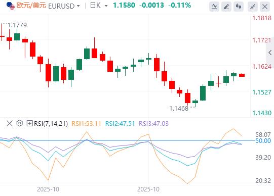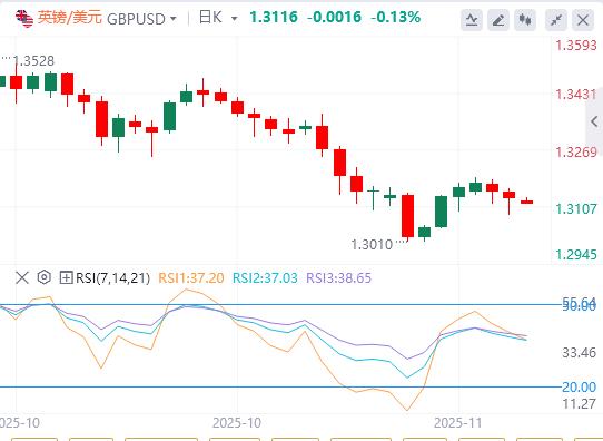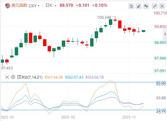 美元指数:截至发稿,美元徘徊在99.56附近。美元近期承压明显,核心压力源于美国劳动力市场的疲软态势与美联储宽松预期的升温。叠加美国政府持续停摆导致关键经济数据停滞发布,市场处于数据真空期,投资者被迫转向美联储官员表态寻求指引,本周美元指数延续上周高点以来的回调走势,为欧元兑美元提供了阶段性支撑。技术面上,美元指数对99.463枢轴点的反应可能会决定下一个方向走势。持续突破99.738可能为测试200日移动平均线100.167打开大门,该均线最近拒绝了100.360的反弹。相反,如果坚定地跌破99.287,可能会引发向50日均线98.481的回落。