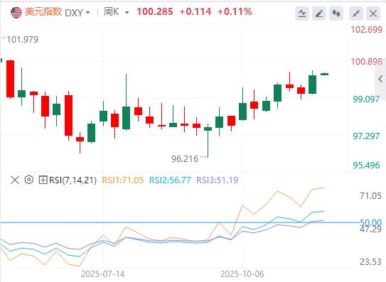11月24日,北京时间周五亚市早盘,美元指数徘徊在100.28附近。上周五,尽管美联储“三把手”鸽派发言令12月降息预期有所回暖,但美元指数维持坚挺,盘中创近6个月新高,最终收跌0.056%,报100.17;美债收益率全线走低,基准的10年期美债收益最终收报4.068%,对美联储政策利率敏感的2年期美债收益率收报3.518%。现货黄金盘中跌超1%后一度转涨,但尾盘再度走弱,最终收跌0.28%,报4065.9美元/盎司,且录得本月来首次周度下跌;现货白银最终收跌1.13%,报50.04美元/盎司。在美国力促俄乌达成和平协议的拖累下,国际原油连续第三个交易日下跌。WTI原油跌至一个月低位,最终收跌1.31%,报57.92美元/桶;布伦特原油最终收跌1.17%,报61.93美元/桶。